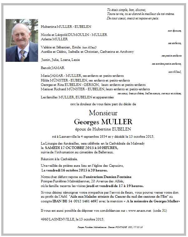Décédé à Bellevaux-Ligneuville (4960) le mardi 13 octobre 2015 à l'âge de 81 ans