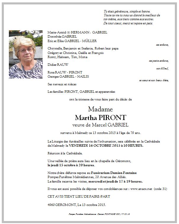 Madame Martha PIRONT veuve de Marcel GABRIEL