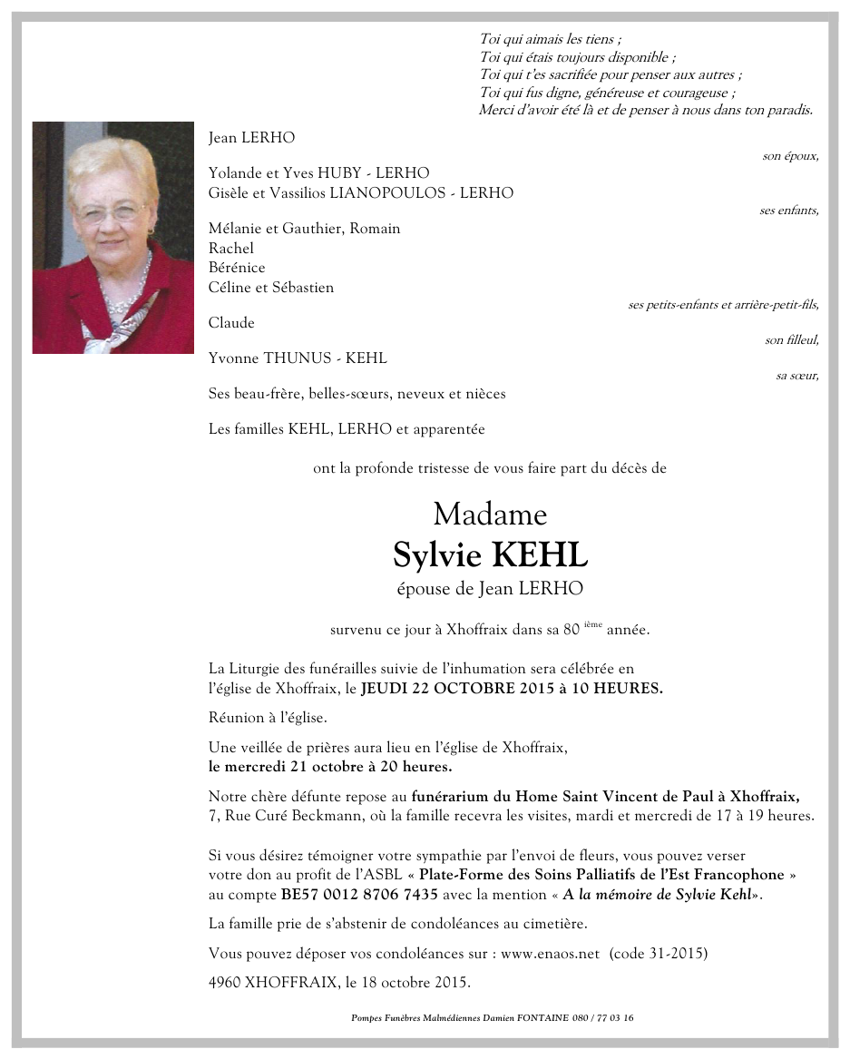 Décédée à Xhoffraix (4960) le dimanche 18 octobre 2015 à l'âge de 79 ans