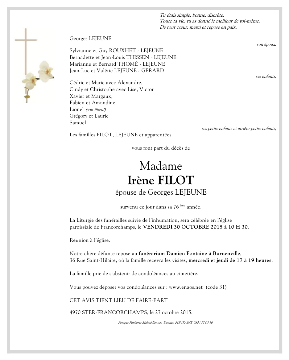 Madame Irène FILOT épouse de Georges LEJEUNE