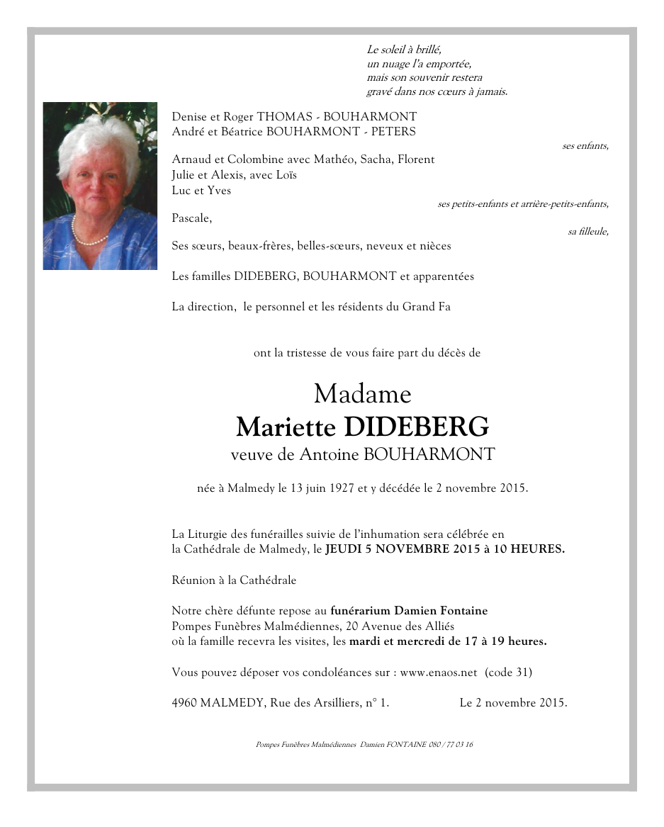 Madame Mariette DIDEBERG veuve de Antoine BOUHARMONT