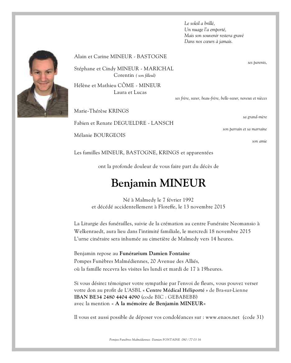 Décédé à Floreffe (5150) le vendredi 13 novembre 2015 à l'âge de 23 ans