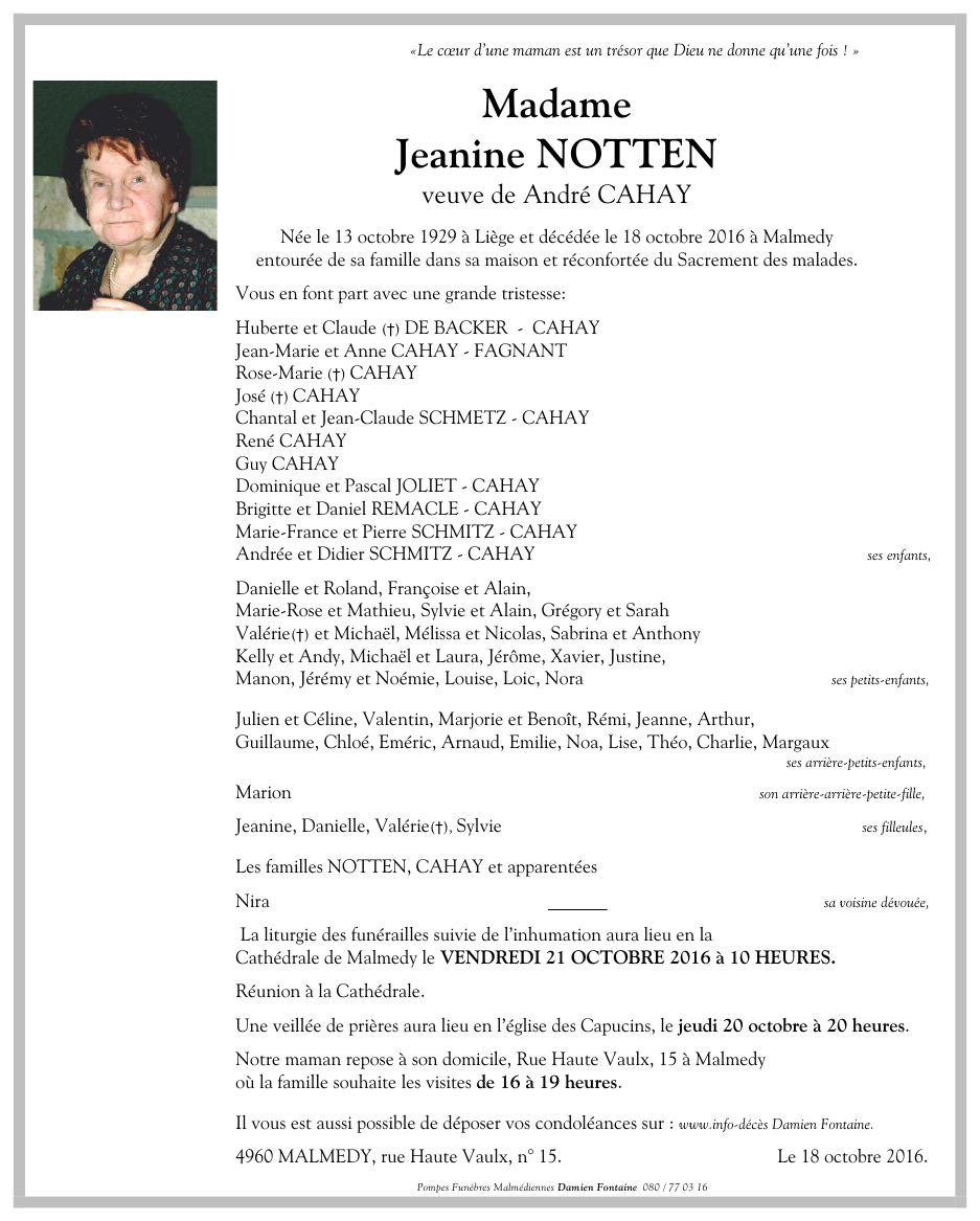 Décédée à Malmedy (4960) le mardi 18 octobre 2016 à l'âge de 87 ans