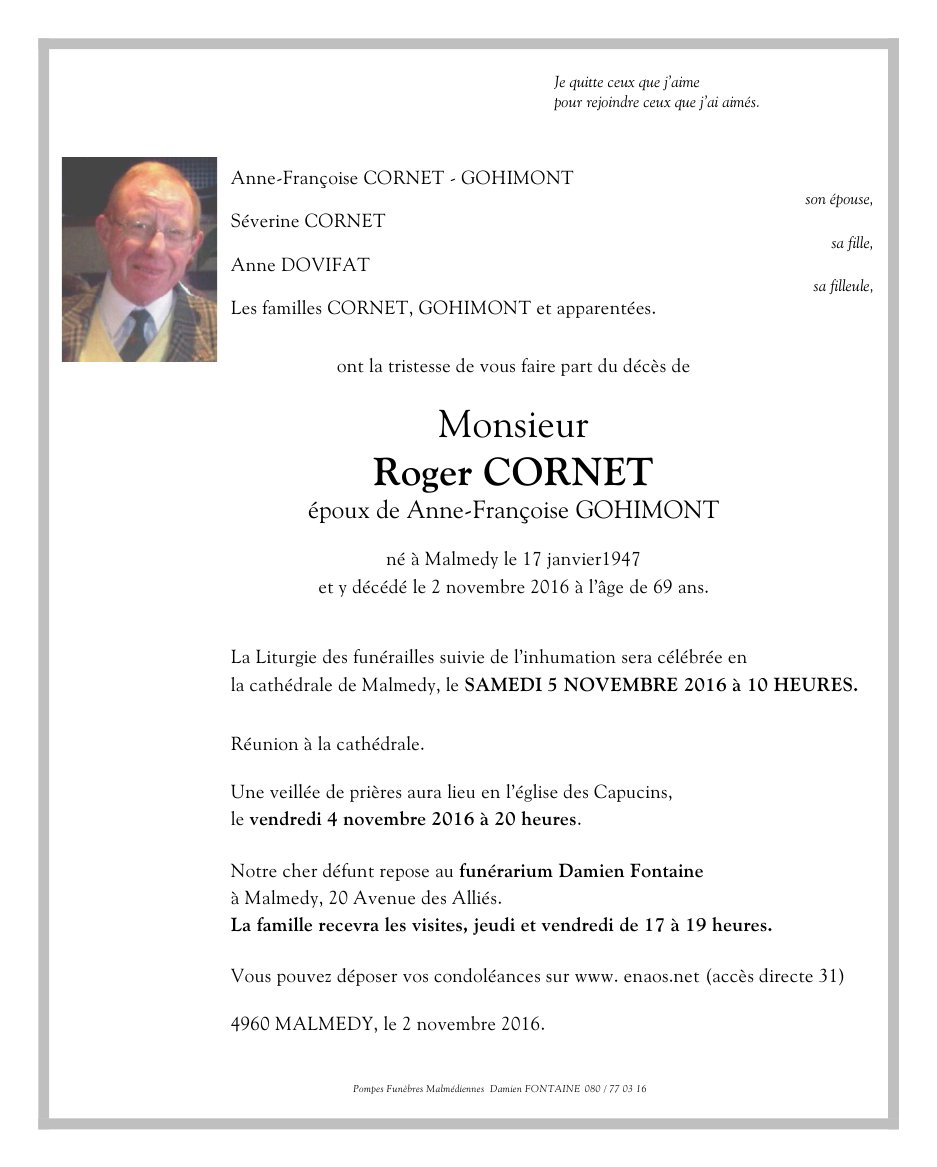 Décédé à Malmedy (4960) le mercredi 2 novembre 2016 à l'âge de 69 ans