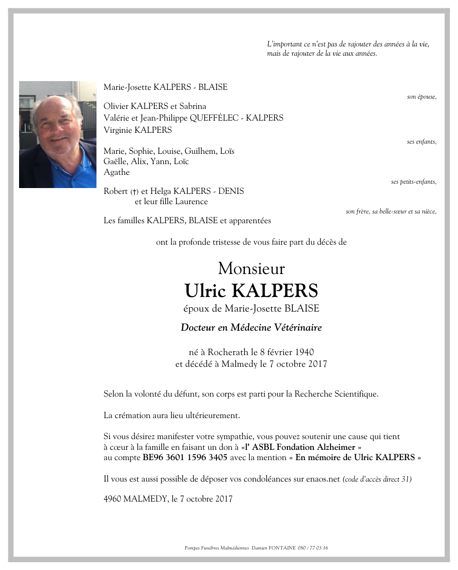 Décédé à Malmedy (4960) le samedi 7 octobre 2017 à l'âge de 77 ans