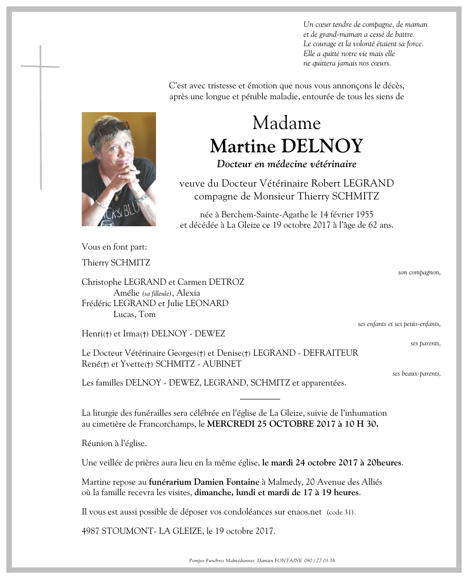 Décédée à La Gleize (4987) le jeudi 19 octobre 2017 à l'âge de 62 ans