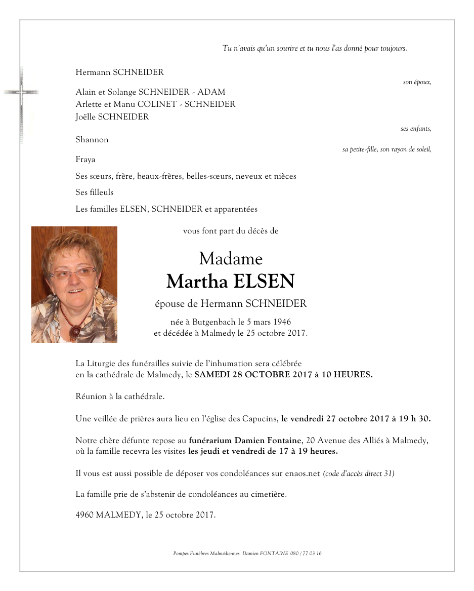 Madame Martha ELSEN épouse de Hermann SCHNEIDER