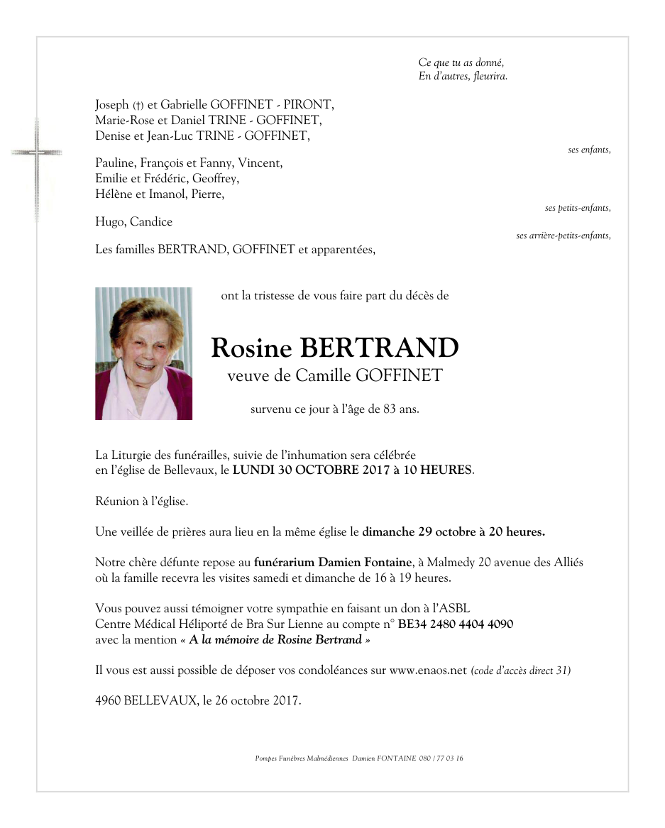 Madame Rosine BERTRAND veuve de Camille GOFFINET