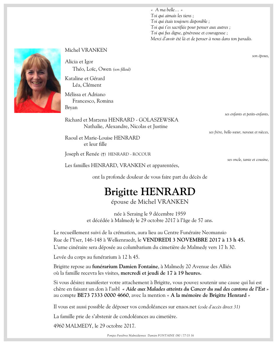 Madame Brigitte HENRARD épouse de Michel VRANKEN