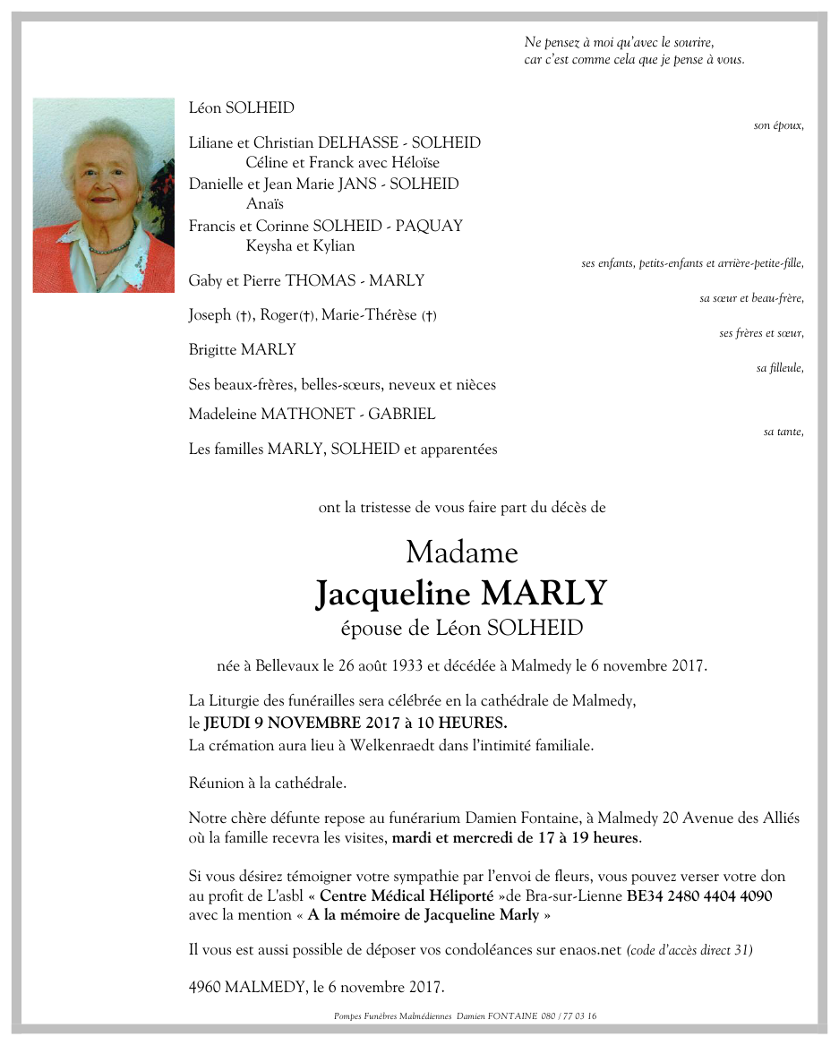 Madame Jacqueline MARLY épouse de Léon SOLHEID