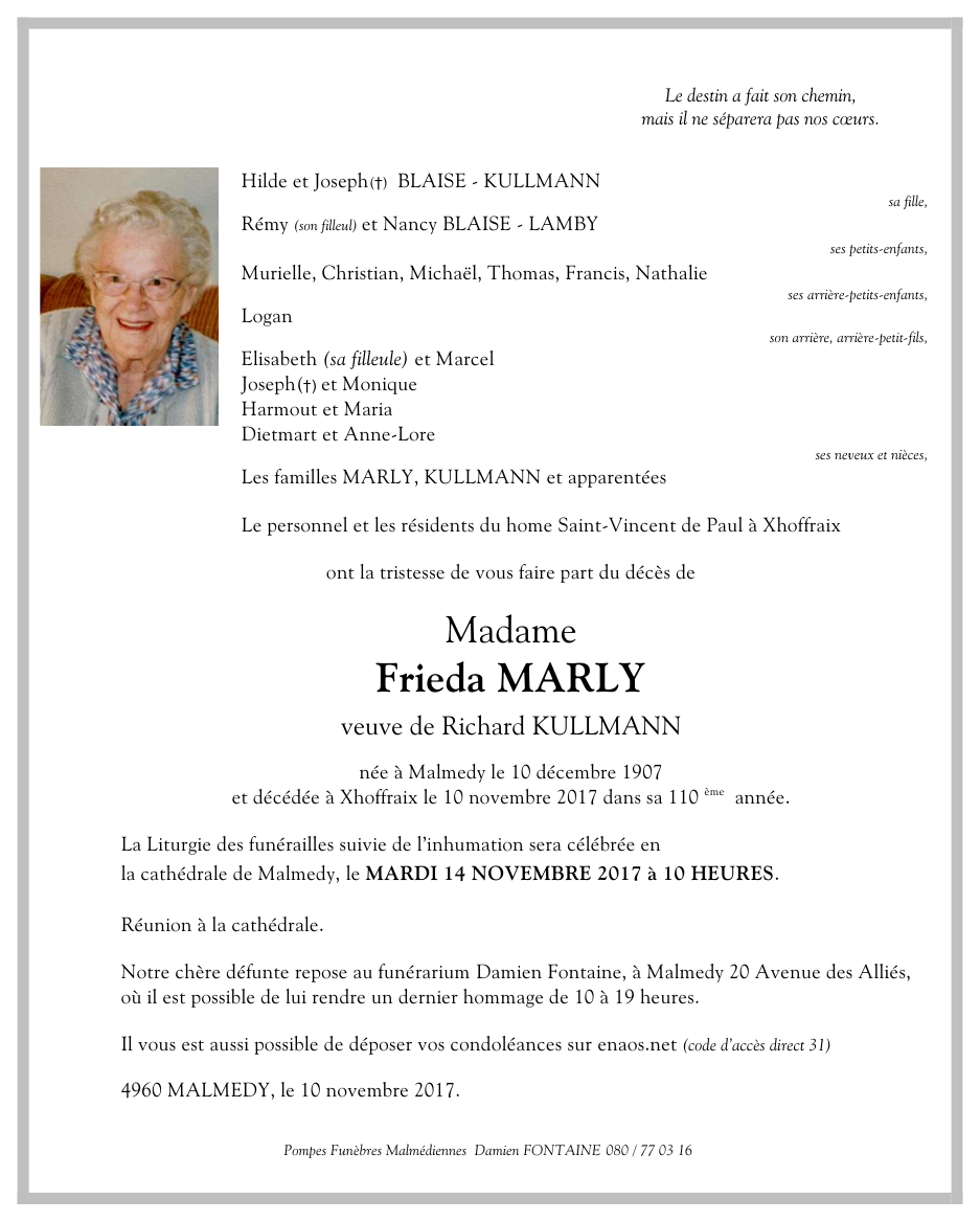 Madame Frieda MARLY veuve de Richard KULLMANN