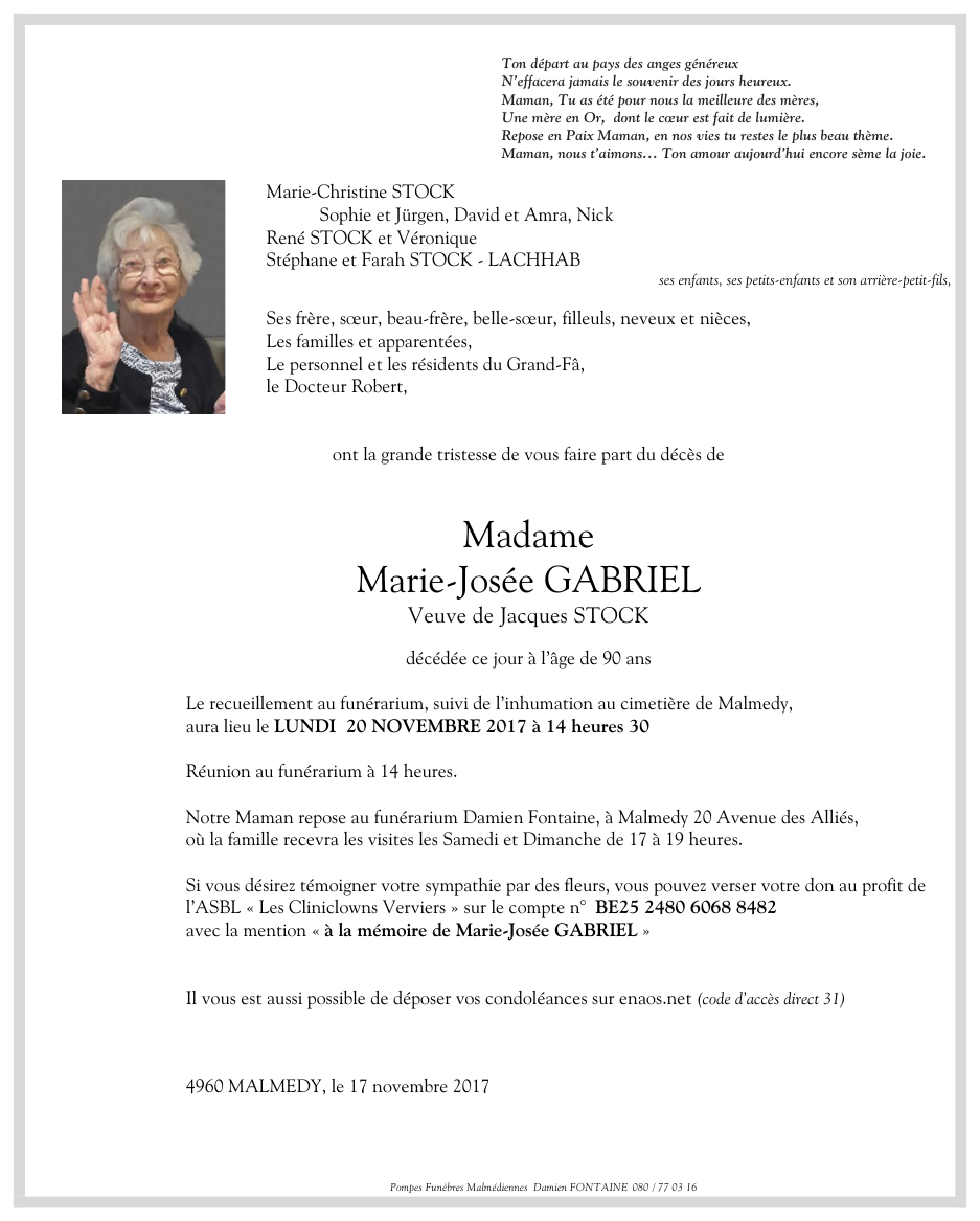 Madame Marie-Josée GABRIEL veuve de Jacques STOCK