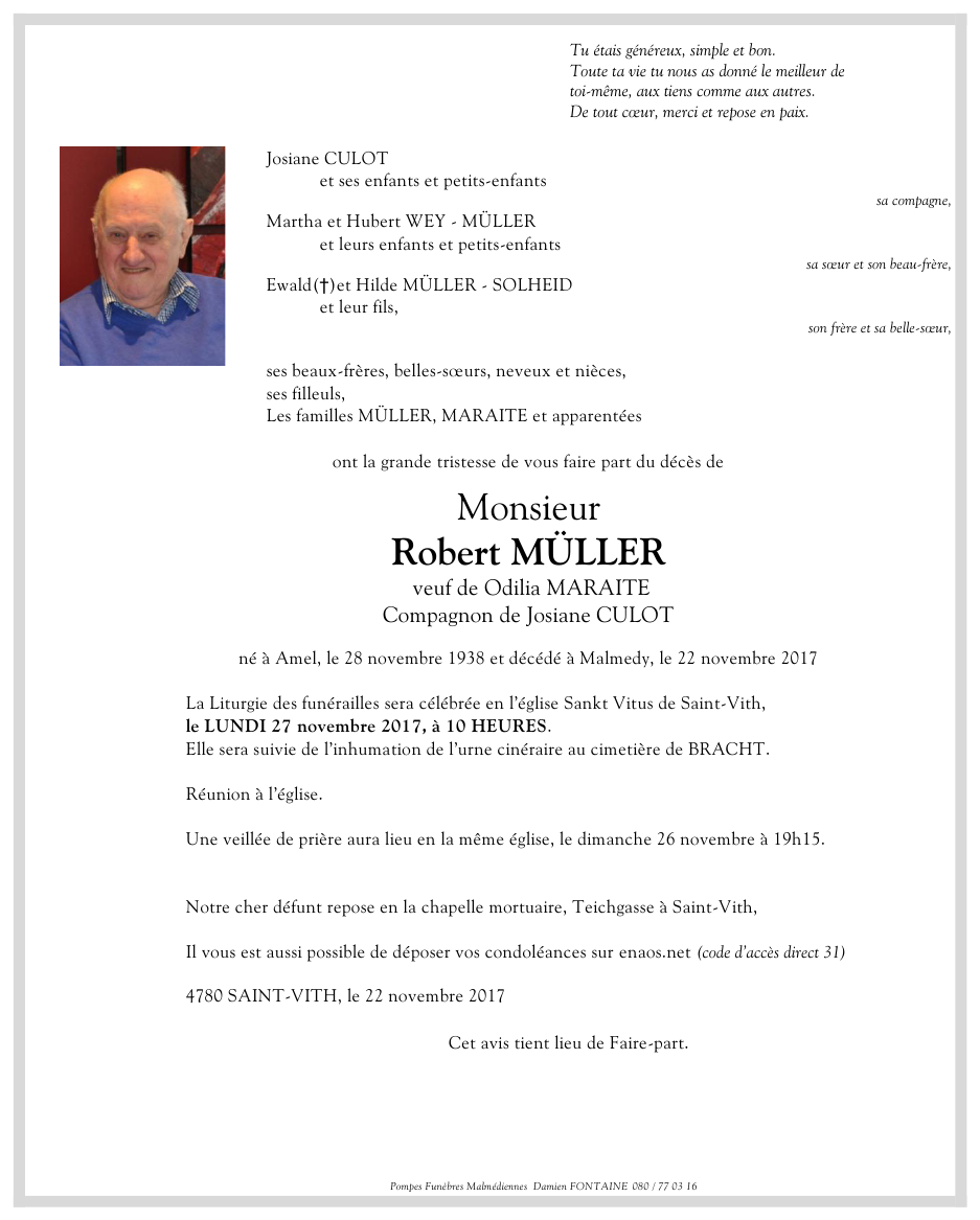 Décédé à Malmedy (4960) le mercredi 22 novembre 2017 à l'âge de 78 ans
