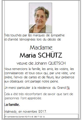Madame Maria SCHÜTZ veuve de Johann QUETSCH