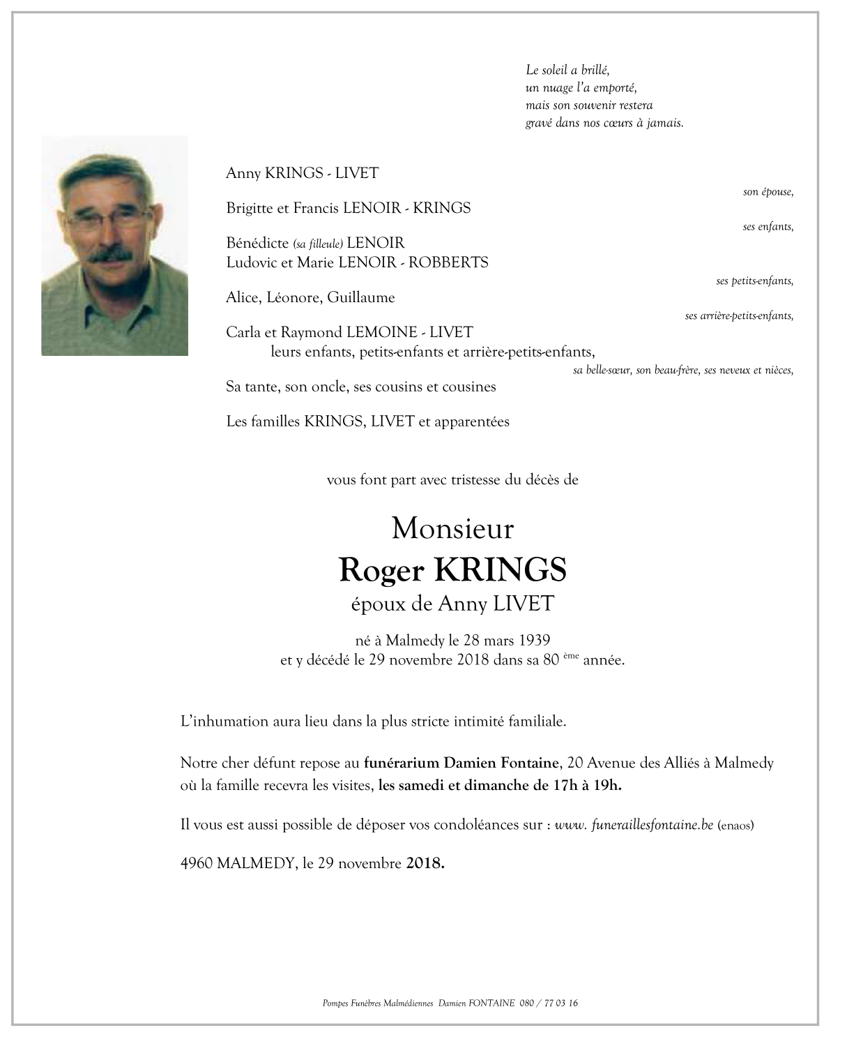 Décédé à Malmedy (4960) le jeudi 29 novembre 2018 à l'âge de 79 ans