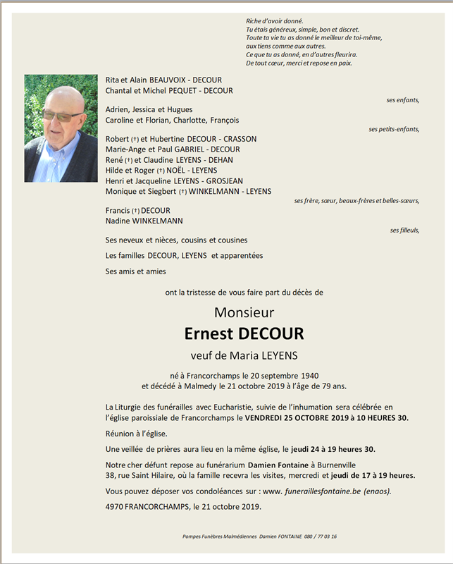 Décédé à Malmedy (4960) le lundi 21 octobre 2019 à l'âge de 79 ans