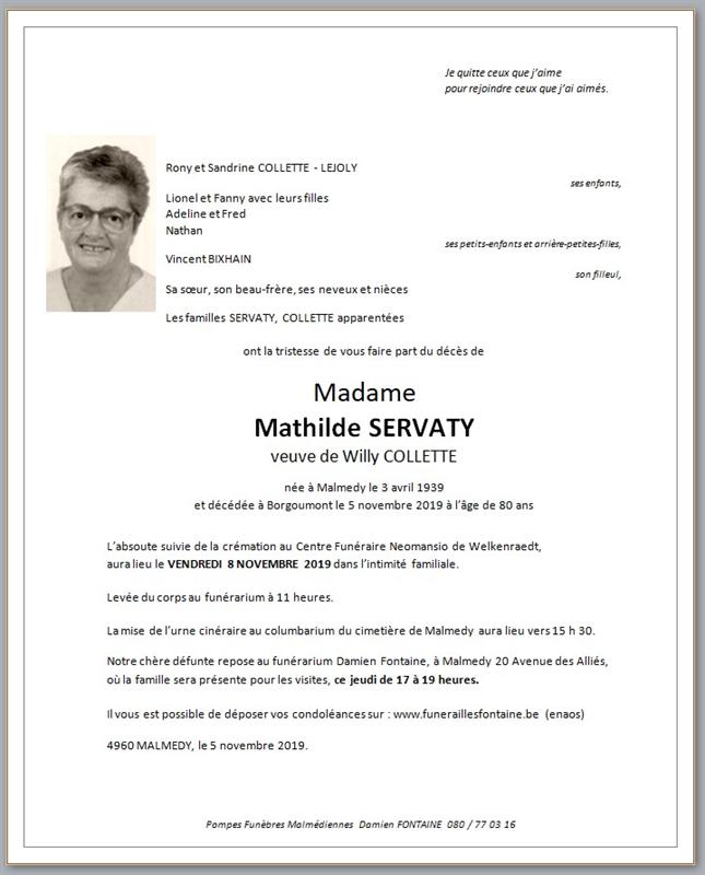Madame Mathilde SERVATY veuve de Willy COLLETTE