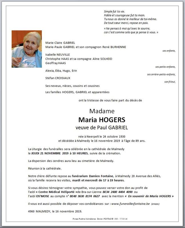 Madame Maria HOGERS veuve de Paul GABRIEL