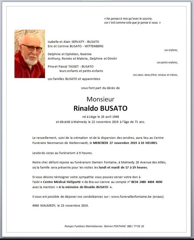 Décédé à Malmedy (4960) le vendredi 22 novembre 2019 à l'âge de 71 ans