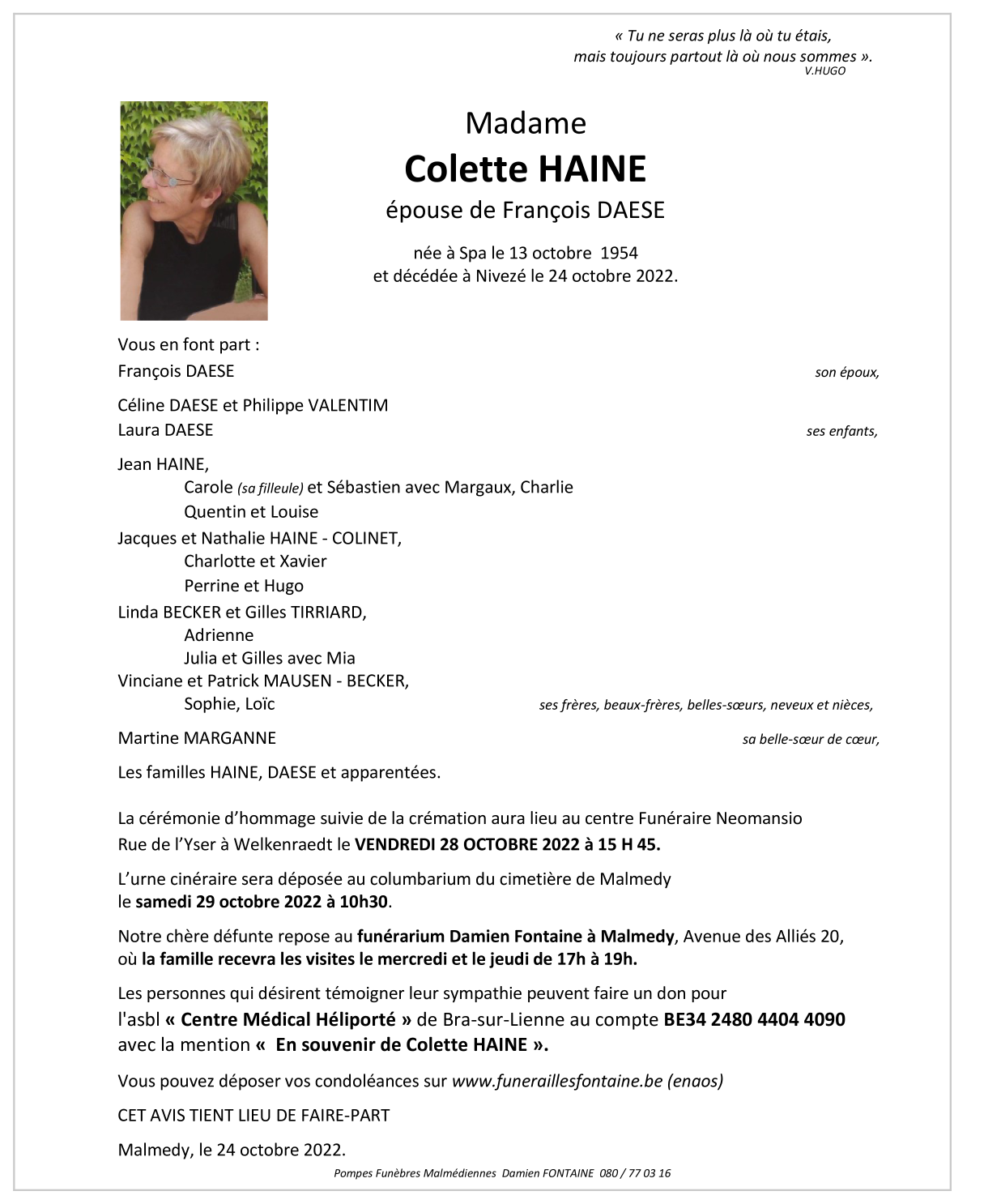 Décédée à Jalhay (4845) le lundi 24 octobre 2022 à l'âge de 68 ans