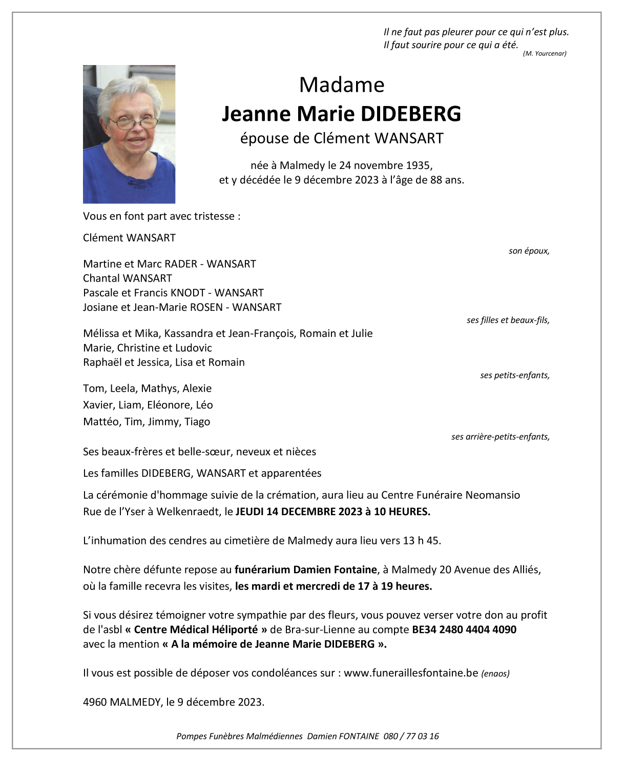 Décédée à Malmedy (4960) le samedi 9 décembre 2023 à l'âge de 88 ans