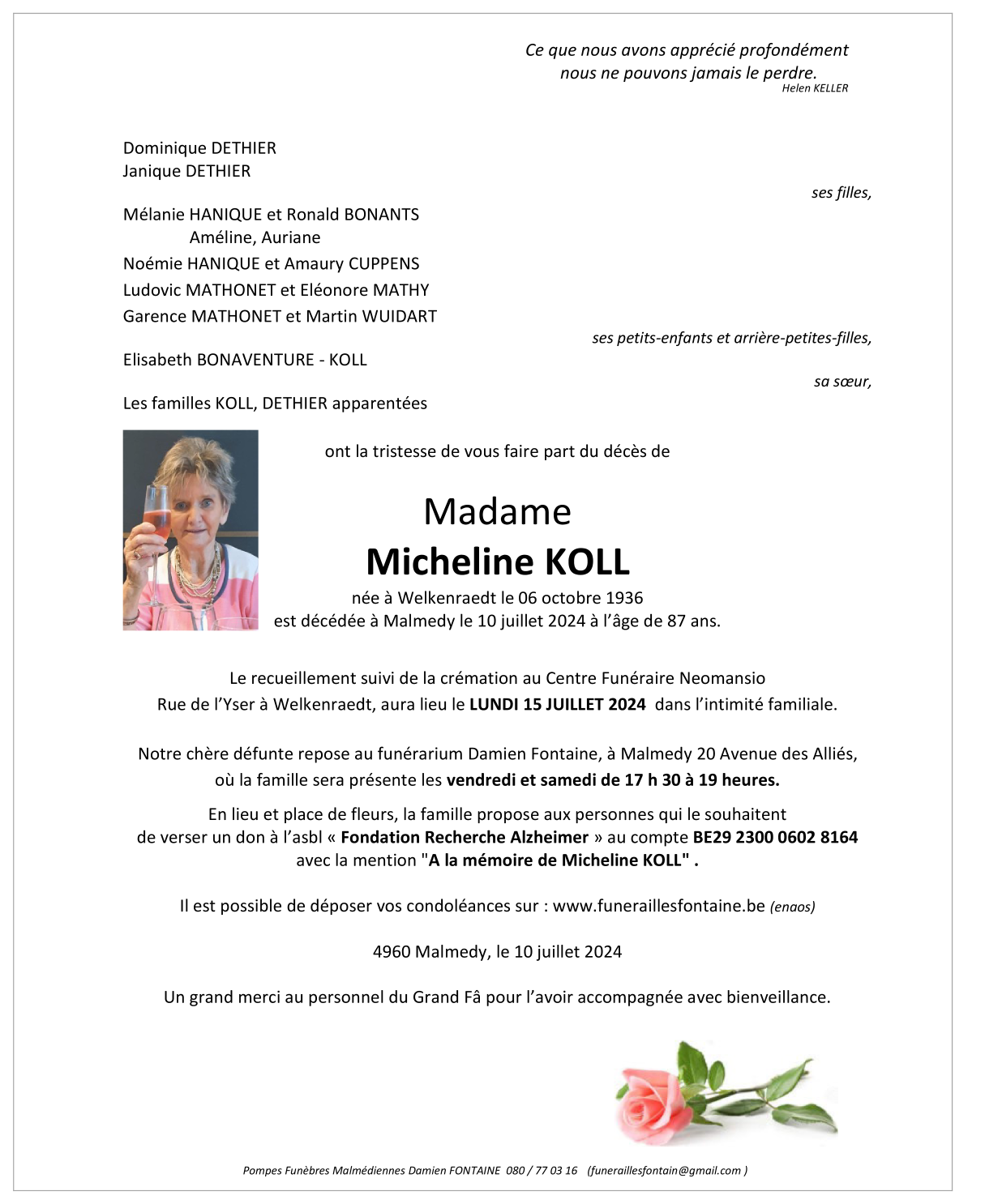 Décédée à Malmedy (4960) le mercredi 10 juillet 2024 à l'âge de 87 ans