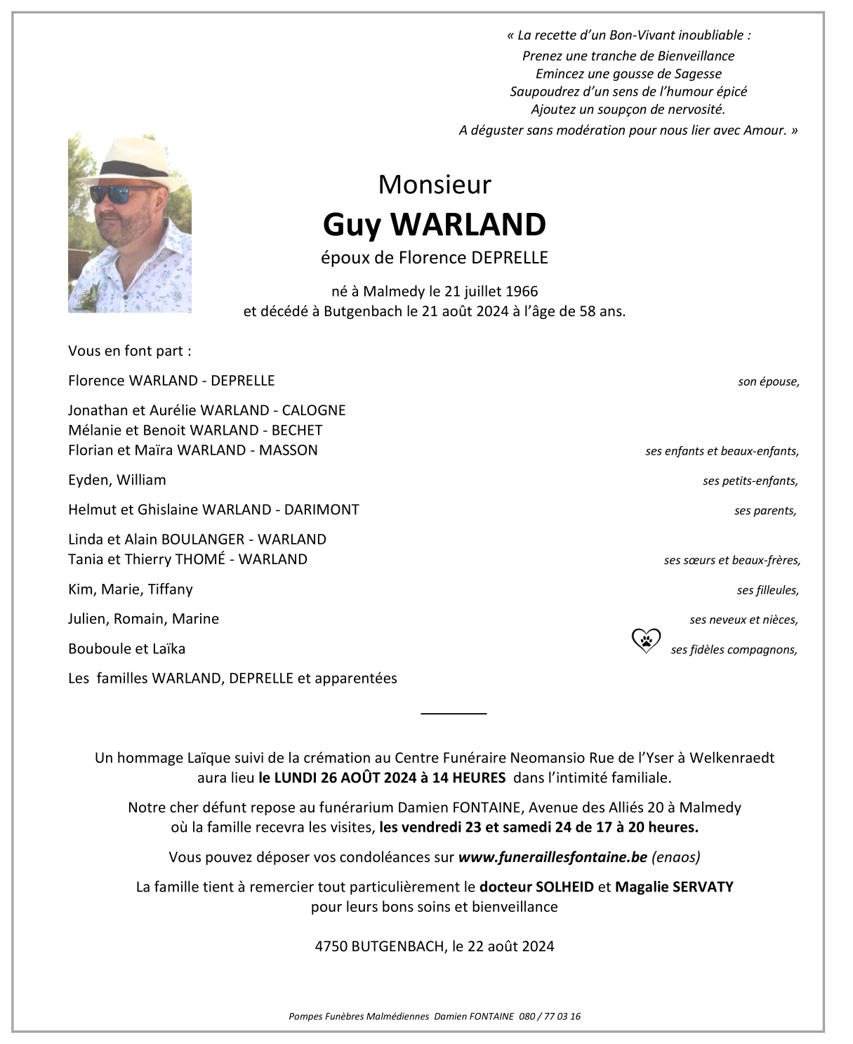Décédé à Butgenbach (4750) le mercredi 21 août 2024 à l'âge de 58 ans