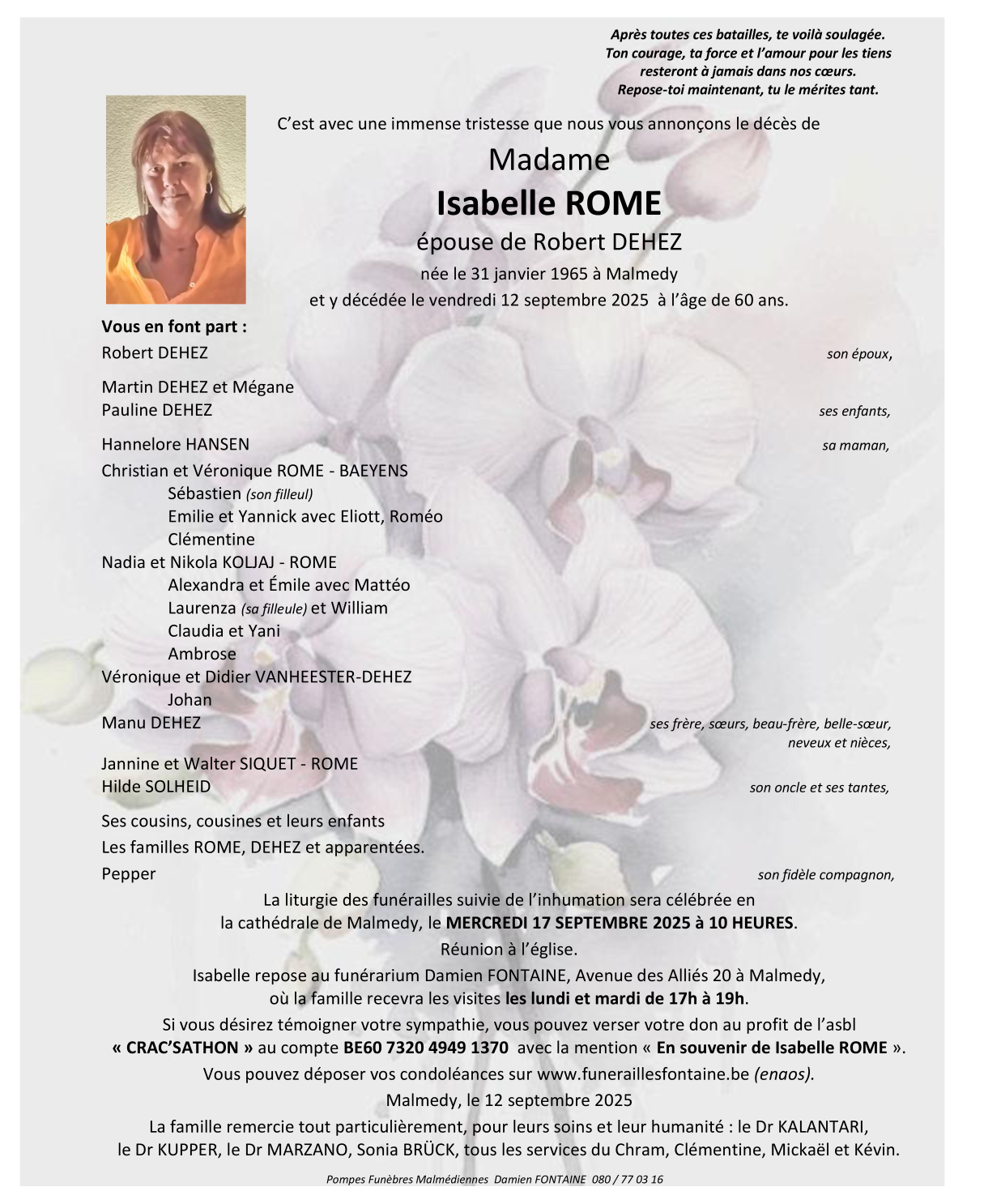 Décédée à Malmedy (4960) le vendredi 12 septembre 2025 à l'âge de 60 ans