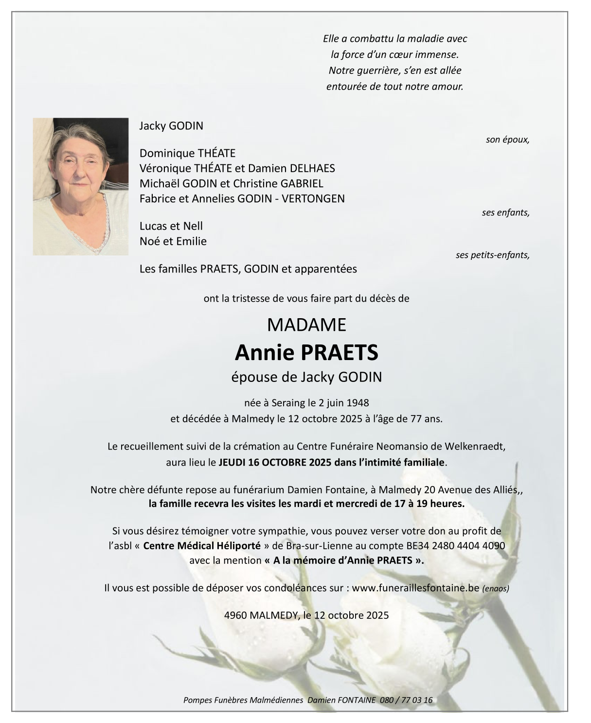 Décédée à Malmedy (4960) le dimanche 12 octobre 2025 à l'âge de 77 ans