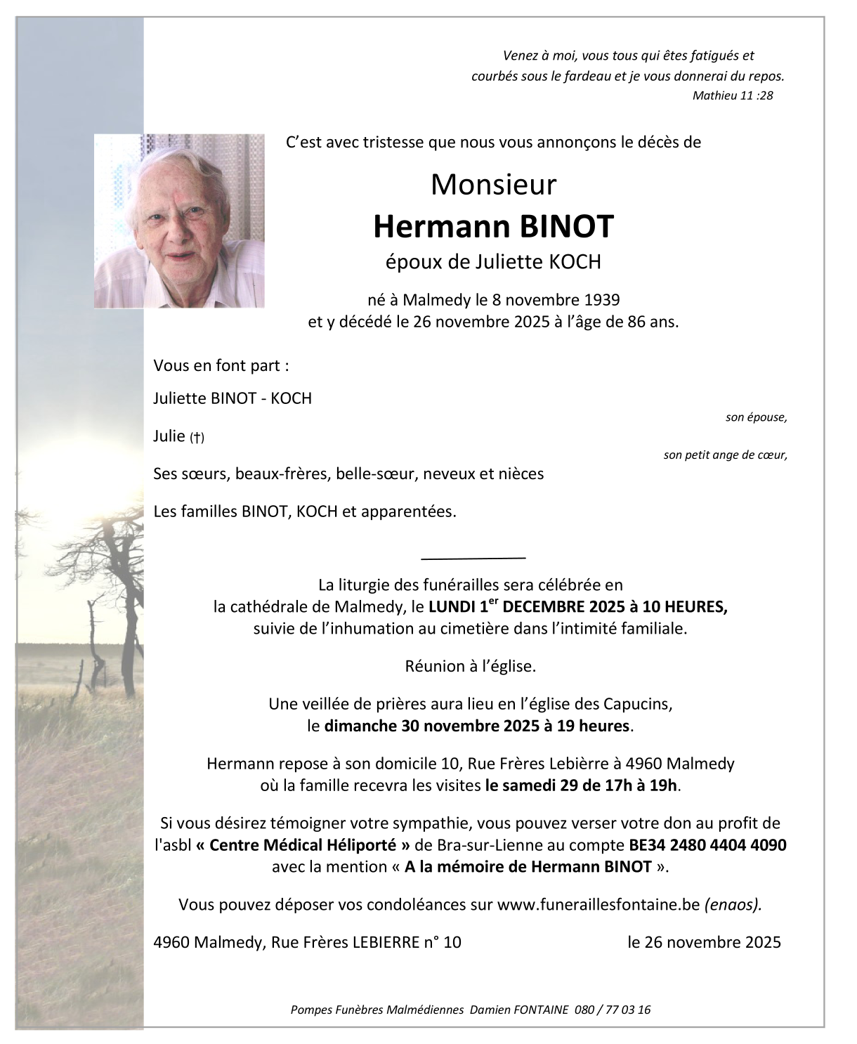 Décédé à Malmedy (4960) le mercredi 26 novembre 2025 à l'âge de 86 ans