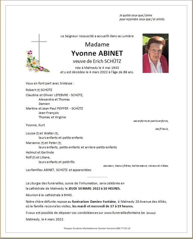 Madame Yvonne ABINET veuve de Erich SCHÜTZ