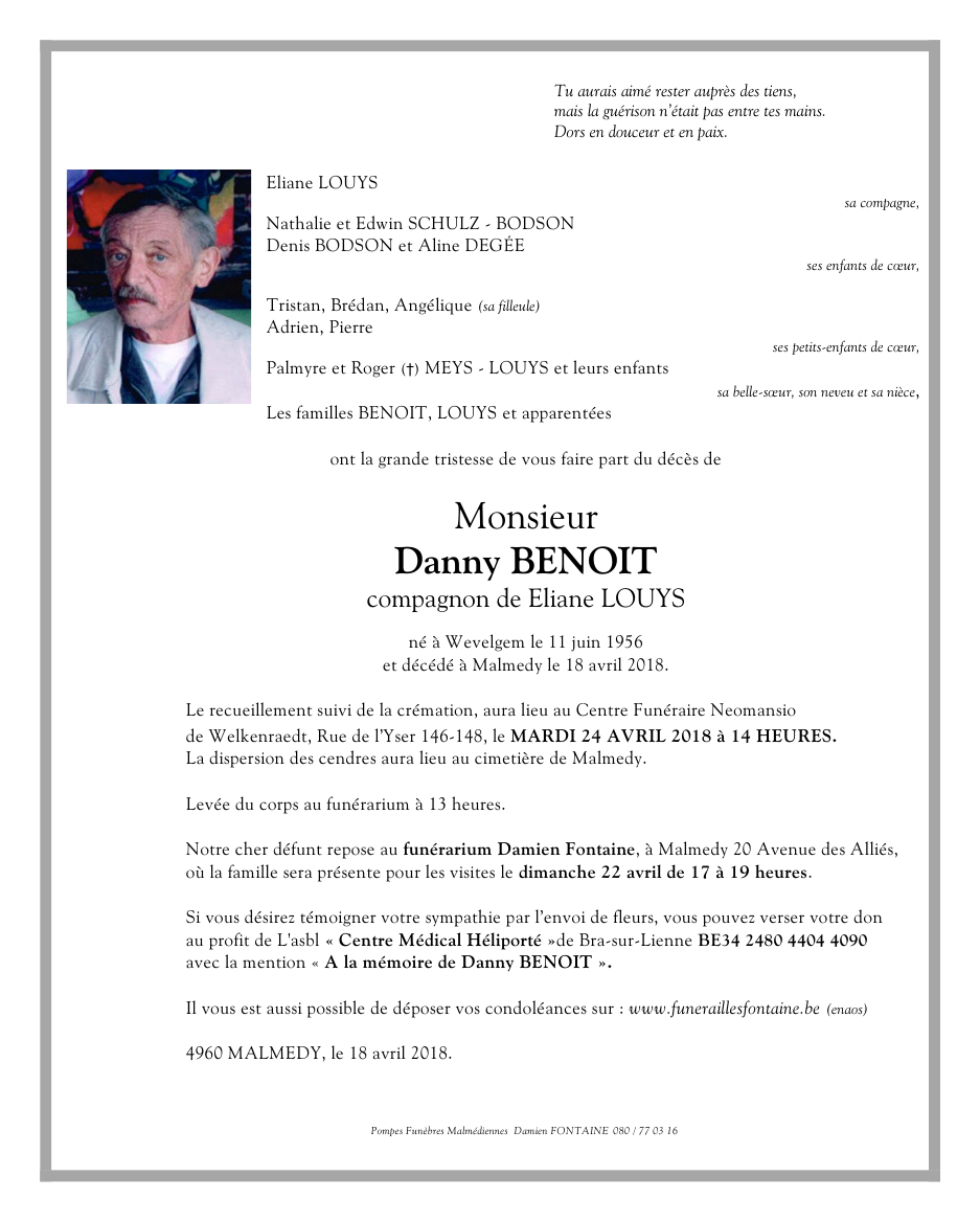 Décédé à Malmedy (4960) le mercredi 18 avril 2018 à l'âge de 61 ans