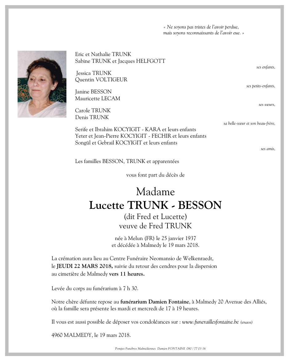 Madame Lucette BESSON veuve de Fred TRUNK