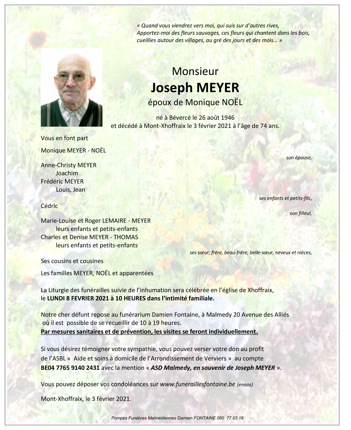 Décédé à Mont (4960) le mercredi 3 février 2021 à l'âge de 74 ans
