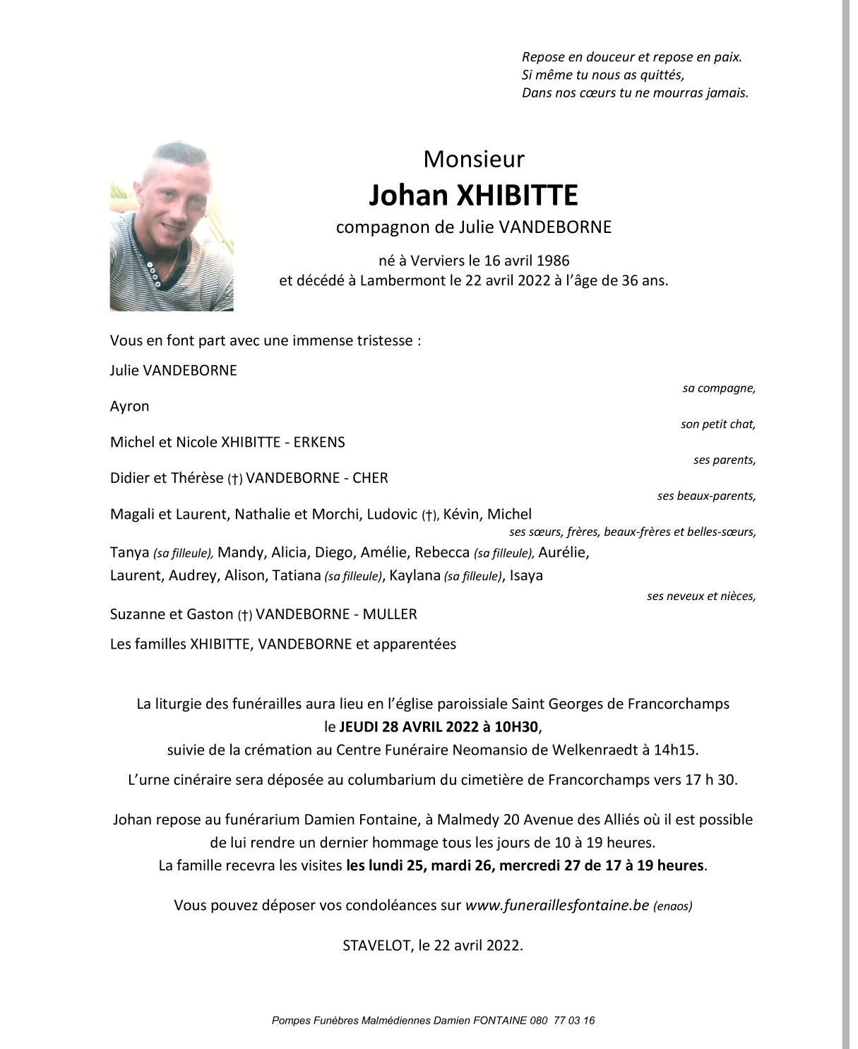 Décédé à Lambermont (4800) le vendredi 22 avril 2022 à l'âge de 36 ans