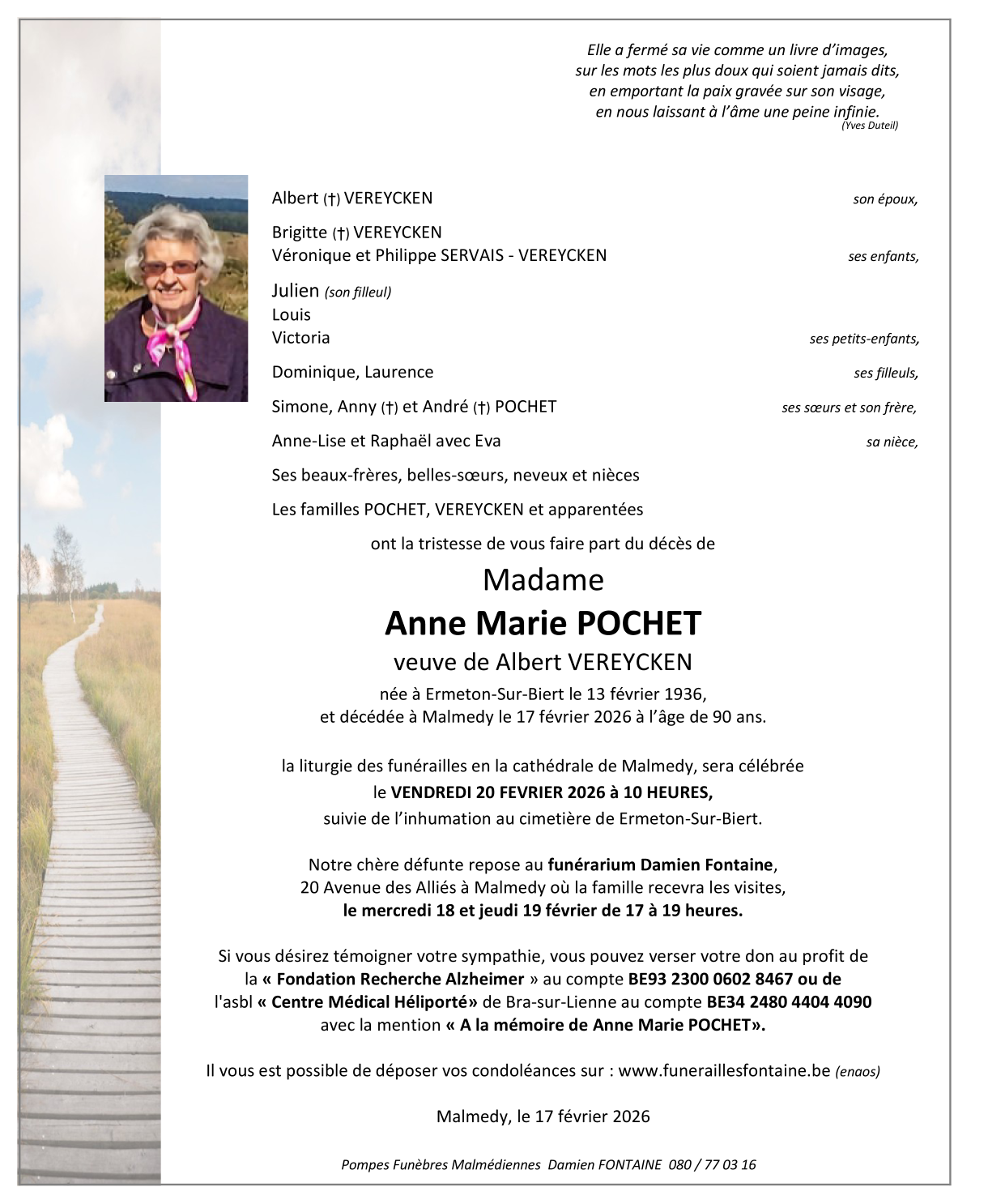 Décédée à Malmedy (4960) le mardi 17 février 2026 à l'âge de 90 ans