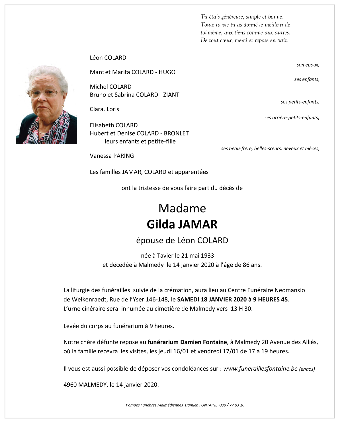 Décédée à Malmedy (4960) le mardi 14 janvier 2020 à l'âge de 86 ans