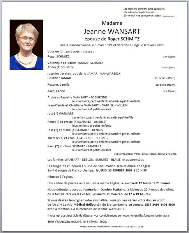Madame Jeanne WANSART épouse de Roger SCHMITZ