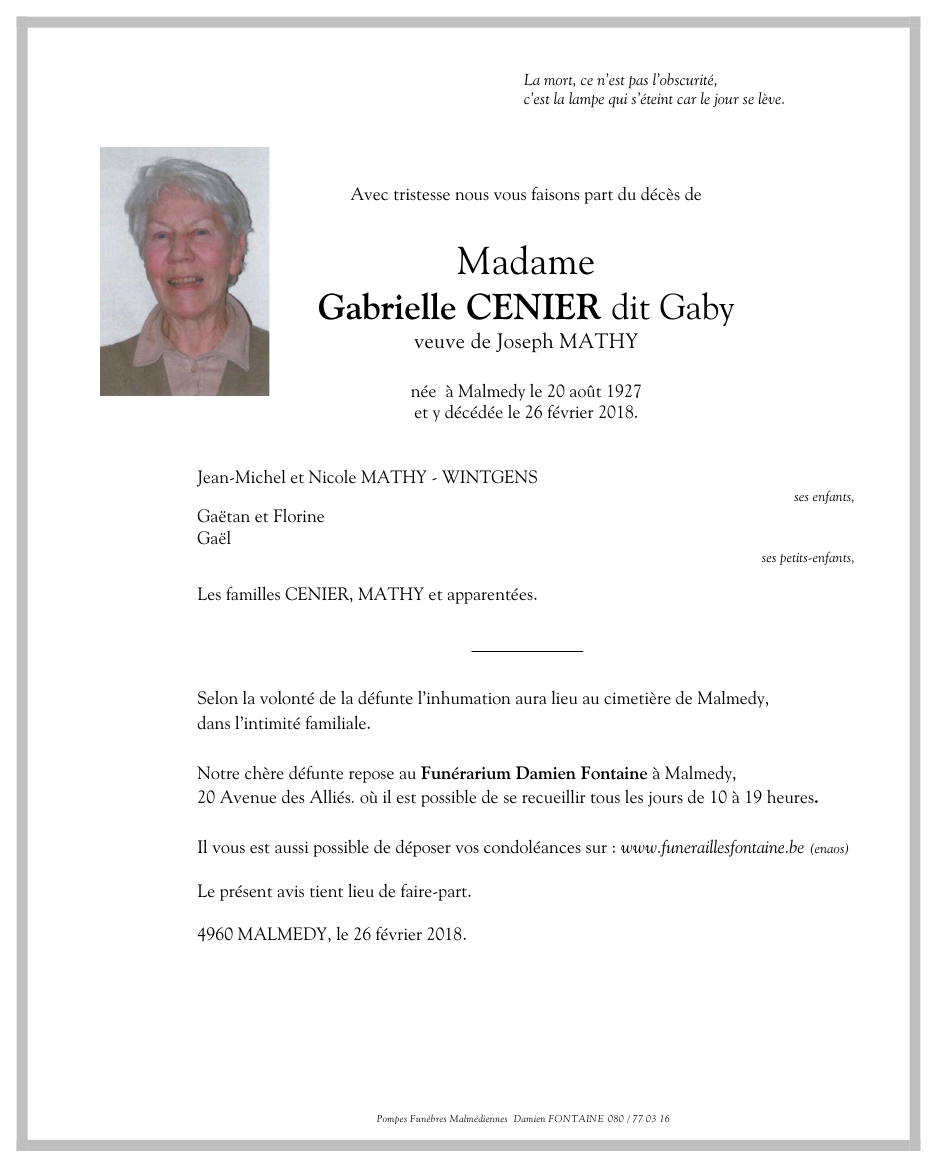 Madame Gabrielle CENIER veuve de Joseph MATHY