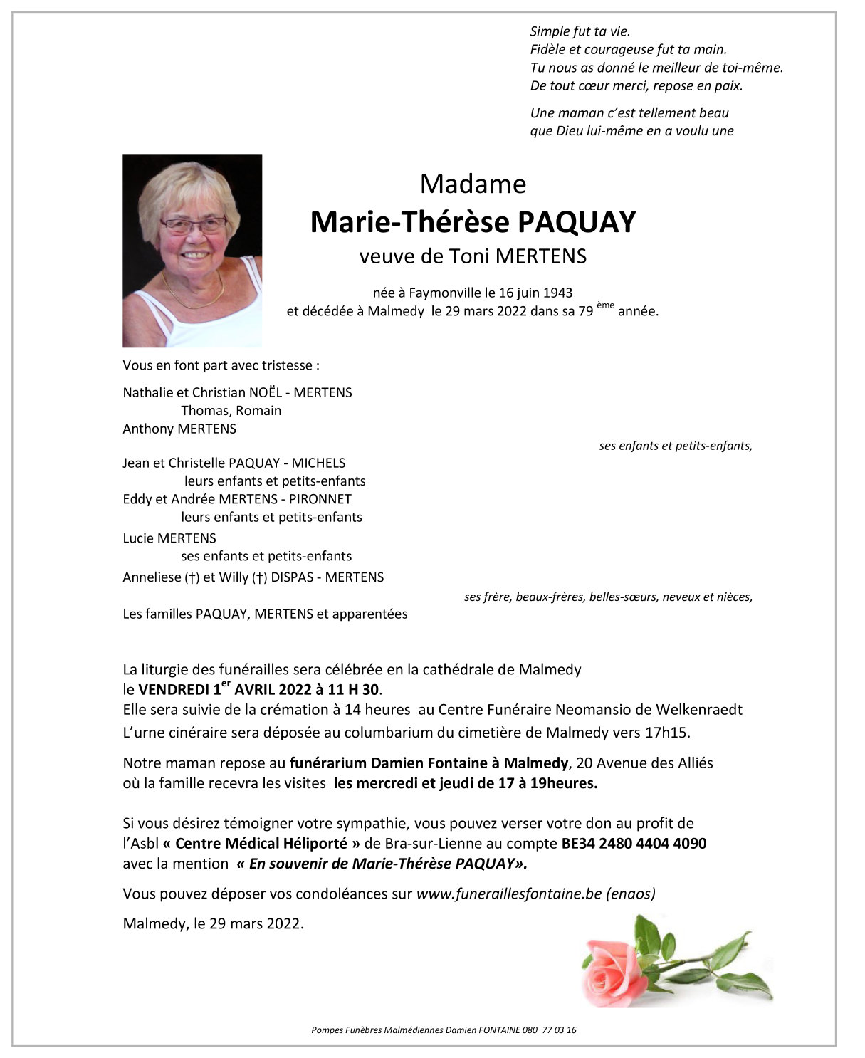 Décédée à Malmedy (4960) le mardi 29 mars 2022 à l'âge de 78 ans