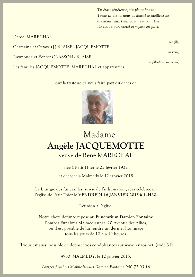 Madame Angèle JACQUEMOTTE veuve de René MARECHAL