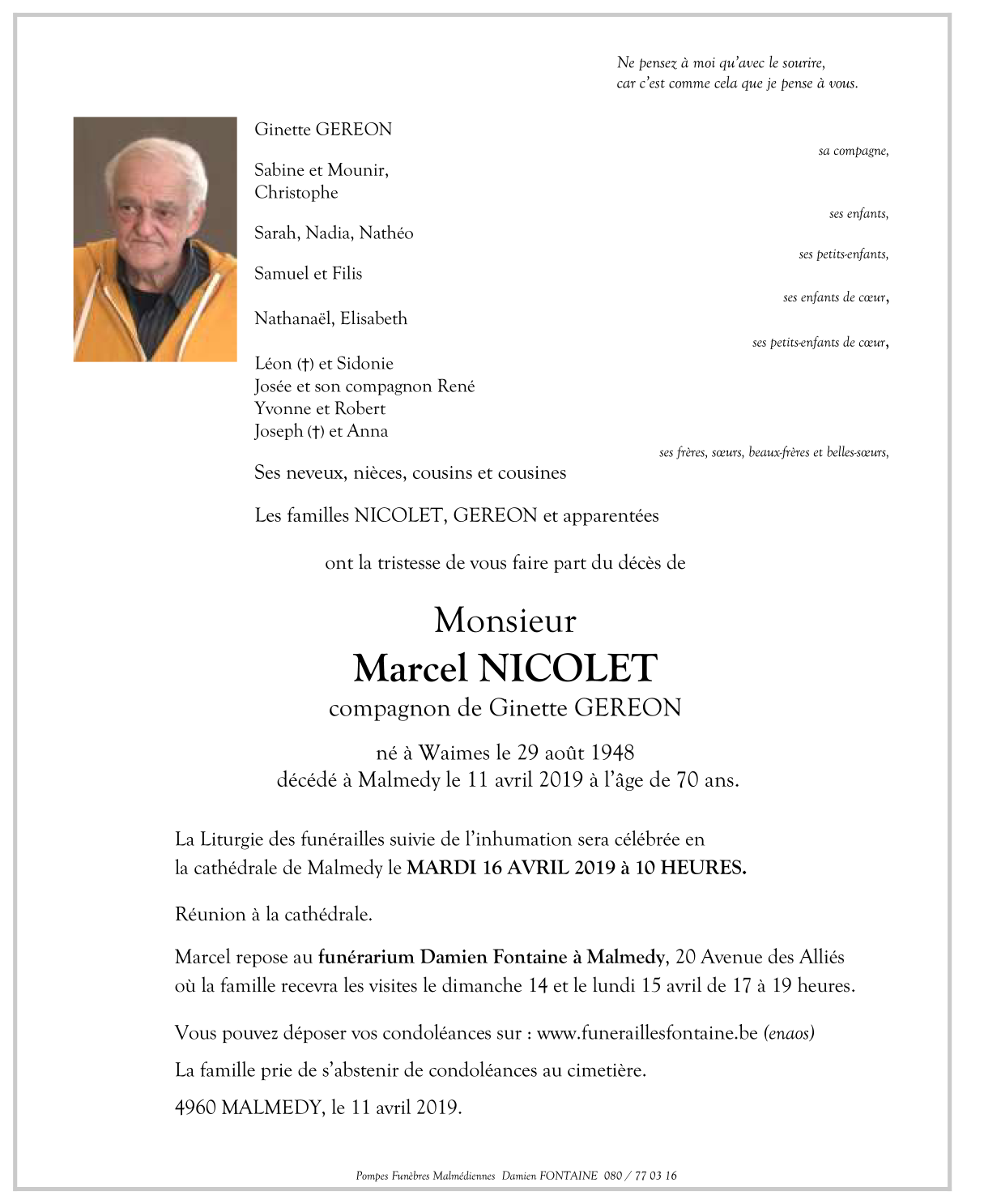 Décédé à Malmedy (4960) le jeudi 11 avril 2019 à l'âge de 70 ans