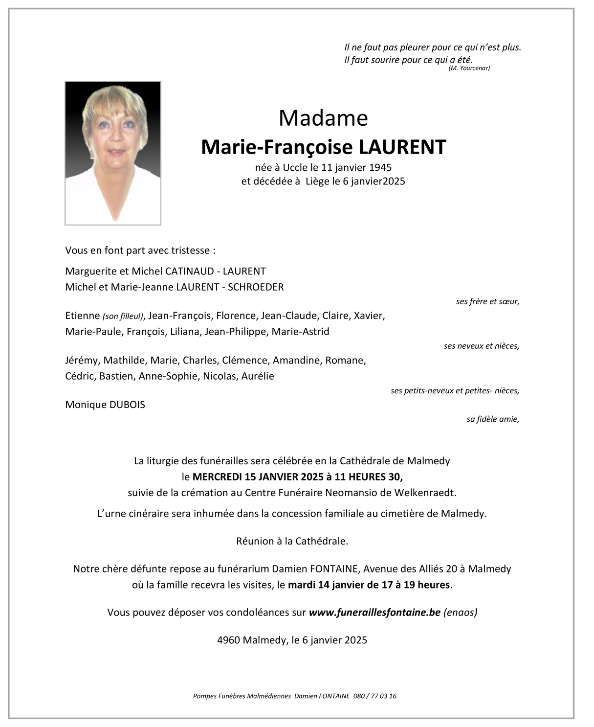 Décédée à Liège (4000) le lundi 6 janvier 2025 à l'âge de 79 ans
