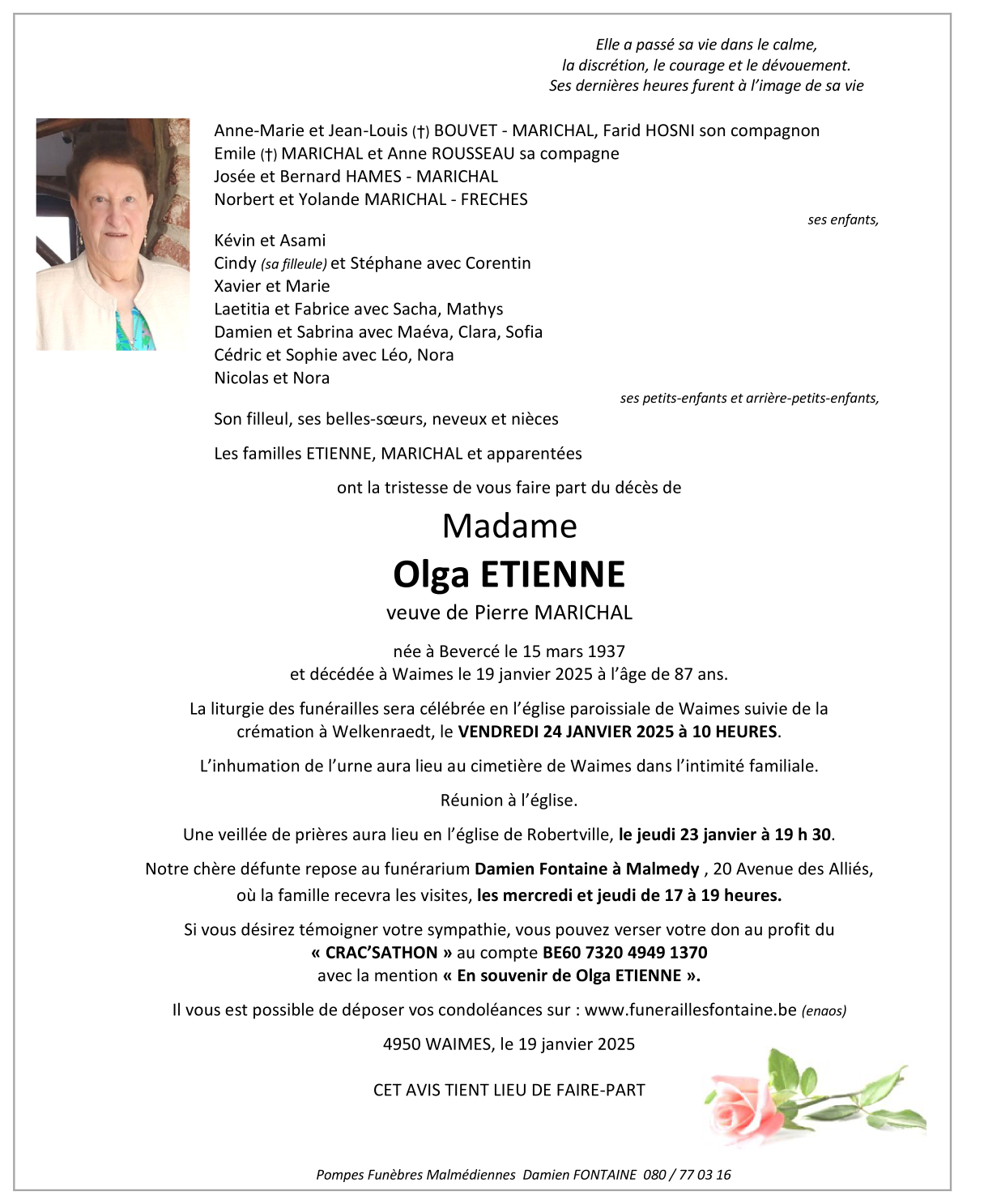 Décédée à Bruyères (4950) le dimanche 19 janvier 2025 à l'âge de 87 ans