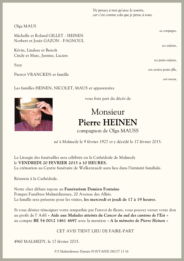 Décédé à Malmedy (4960) le mardi 17 février 2015 à l'âge de 88 ans