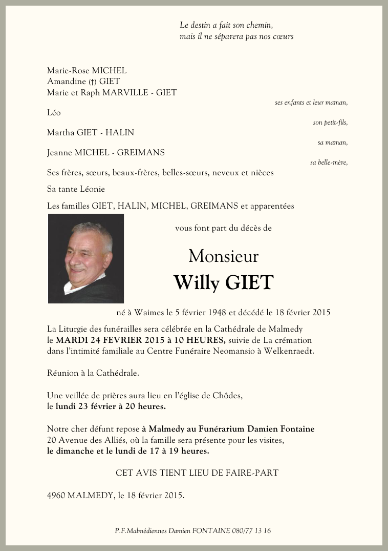Décédé à Spa (4900) le mercredi 18 février 2015 à l'âge de 67 ans
