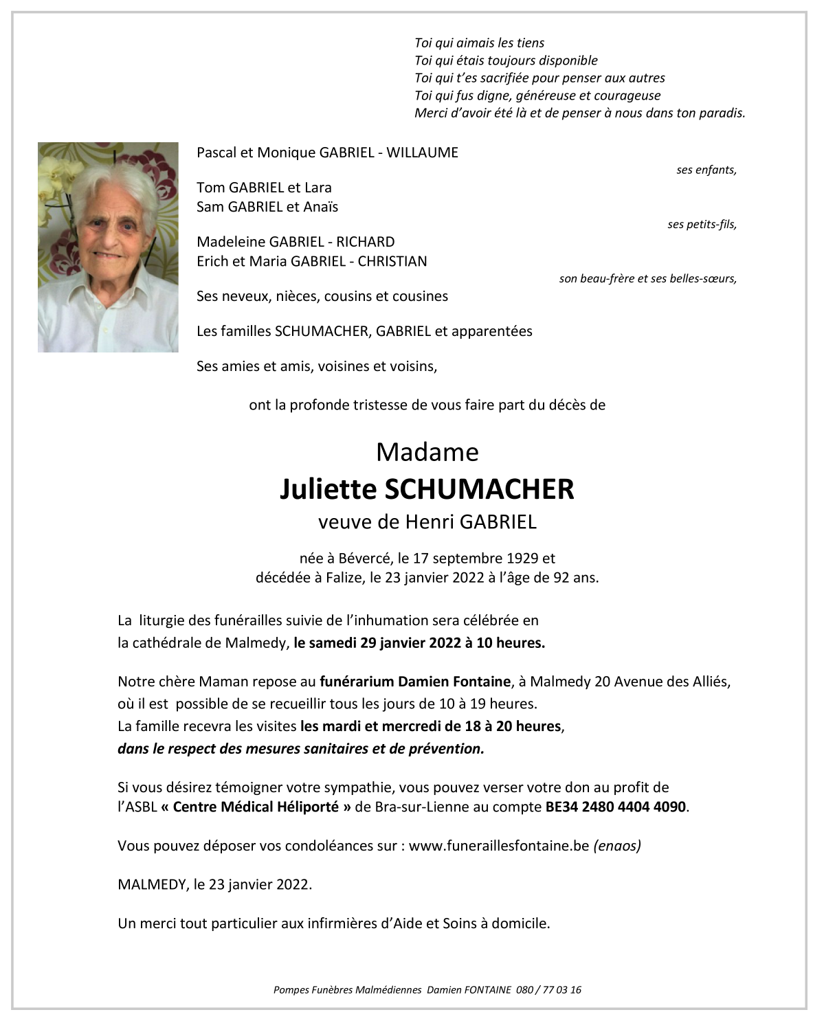 Décédée à Malmedy (4960) le dimanche 23 janvier 2022 à l'âge de 92 ans