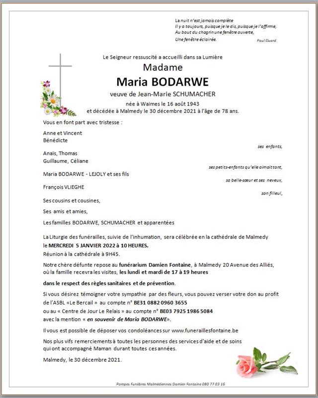 Madame Maria SCHUMACHER née BODARWE