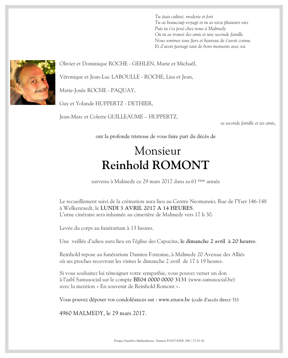 Décédé à Malmedy (4960) le mercredi 29 mars 2017 à l'âge de 60 ans