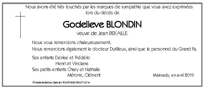 Madame Godelieve BLONDIN veuve de Jean BEKAILLE